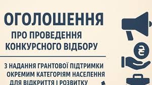 ОГОЛОШЕННЯ ПРО ПРОВЕДЕННЯ КОНКУРСНОГО ВІДБОРУЗ НАДАННЯ ГРАНТОВОЇ ПІДТРИМКИ ОКРЕМИМ КАТЕГОРІЯМ НАСЕЛЕННЯ ДЛЯ ВІДКРИТТЯ І РОЗВИТКУ ВЛАСНОЇ СПРАВИ На виконання Комплексної програми розвитку малого і середнього підприємництва в Запорізькій області на 2025-2027 роки (далі – Програма), яка затверджена розпорядженням голови Запорізької обласної державної адміністрації, начальника Запорізької…